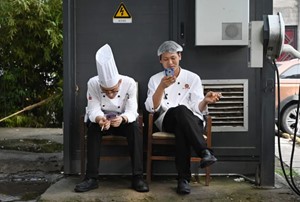 استراحت دو سرآشپز در بیرون رستورانی در پکن/ خبرگزاری فرانسه